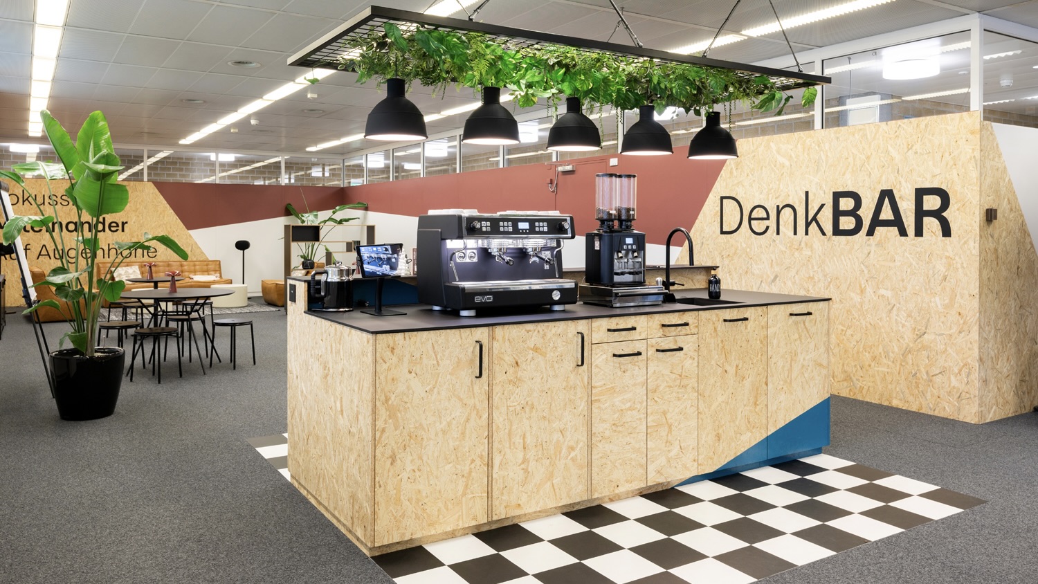 Ehrliche Materialien wie OSB- Platten, Stahl und gezielte Signaletik verhelfen den bestehenden Räumen zu einem inspirierenden und modernen Ausdruck, welcher Teams anzuziehen vermag. Der temporäre Charakter verbindet die drei Räume und sorgt für einen kreativen und inspirierenden Workshop-Charakter. Das Highlight ist sicher die “DenkBAR”, in welche eine Barista-Kaffeemaschine integriert wurde, welche das Magnet für Treffen und Austausch ist.